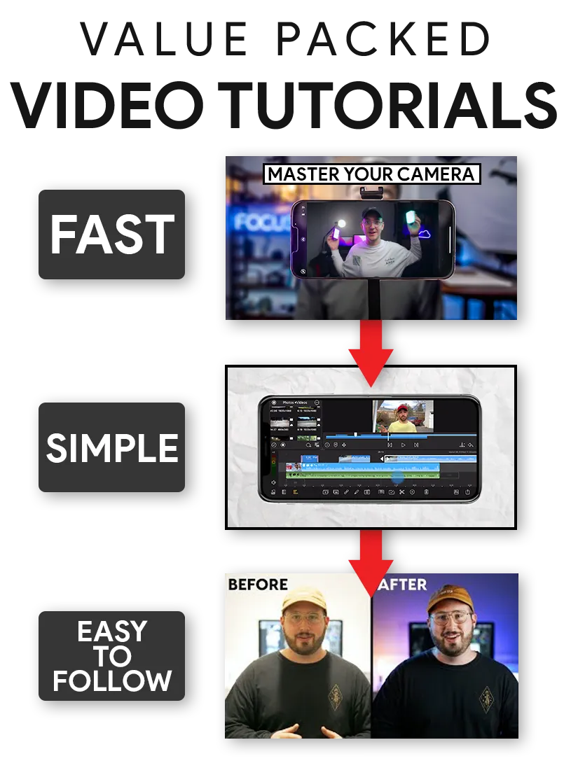 14 Day Filmmaker was designed to take somebody from knowing nothing about shooting or editing videos with a smartphone or professional camera –> to being able to produce cinematic & professional-looking content (no matter what camera they own).